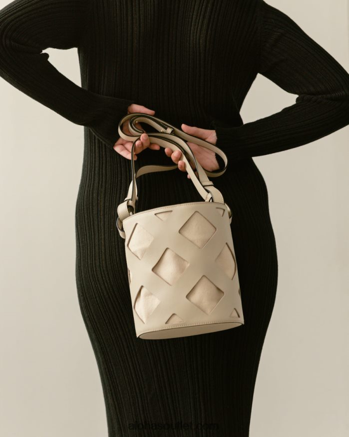 Bolsa bucket de couro branco com detalhes cortados a laser